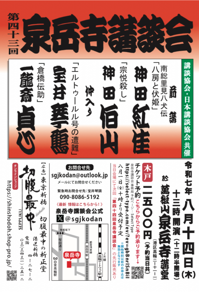 おはようございます。今日から9月!…ということで、9月の泉岳寺講談会、予約開始日です! ☆9月14日(日)泉岳寺講談会【開演】13:00【出演】小琴 『ほどくぼ小僧』祝二ツ目昇進 鯉風 『不破数右衛門』 陽乃丸 『左甚五郎』 琴星 『加藤清正』【場所】泉岳寺・講堂【木戸】当日・予約2500円【問合】090-8086-5192 ※Web予約【9月1日 10時】受付開始 第43回泉岳寺講談会(2025年8月14日開催)泉岳寺講談会※前売り、Web予約分にて‘’全席完売の公演”の場合、会場での当日券、キャンセル券の発売はございません。※完売公演の場合はTwitterアカウント@sgjkodanにて告知致します。※通常、自動返信メールにて予約確定のご連絡となりますが、予約開始時間より【前】にお申し込みの場合は、自動返信メールが届いた場合も【無効】となりますので、お申し込み時間…select-type.com 小琴ちゃんの昇進お祝いの会!でもありますので、ぜひ、お運びくださいますようお願い申し上げます!